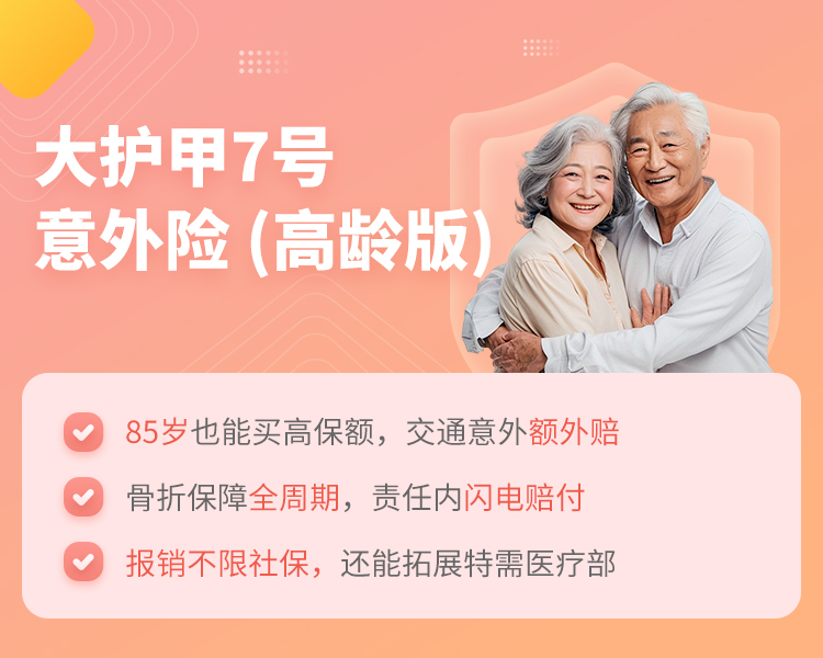 中国人保大护甲7号意外险(高龄版)上线啦!!! 亮点如下: 1、85岁也能买高保额,交通意外额外赔 2、骨折保障全周期,责任内闪电赔付 3、报销不限社保,还能拓展特需医疗部 购买链接: https://bckan.com/?t=5228
