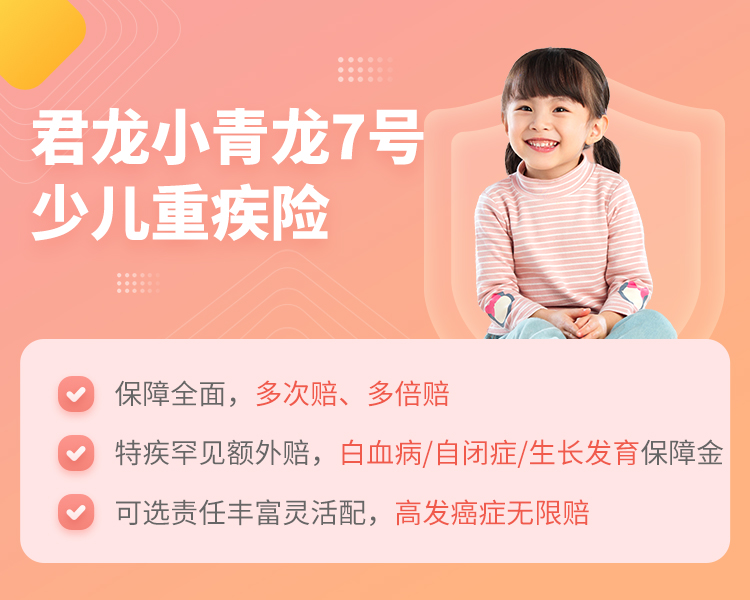 君龙小青龙7号少儿重大疾病保险上线啦!!! 亮点如下: 1、保障全面,多次赔、多倍赔 2、特疾罕见额外赔,白血病/自闭症/生长发育保障金 3、可选责任丰富灵活配,高发癌症无限赔 购买链接: https://m.bckan.com/?t=5234